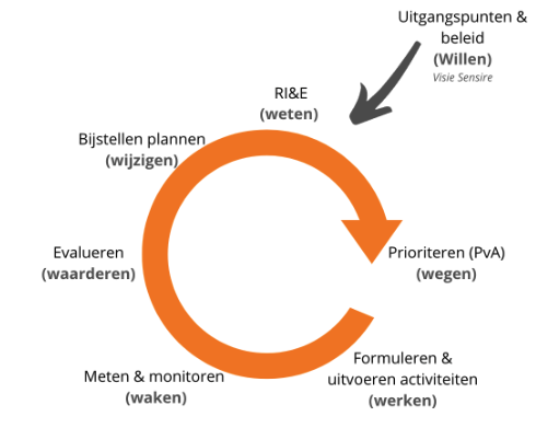 Sensire streeft naar optimale arbeidsomstandigheden voor alle mensen die binnen de organisatie werken. Veilig en gezond werken, medewerkergeluk en duurzame inzetbaarheid zijn belangrijke speerpunten voor Sensire, nu en in de toekomst. De visie op arbeidsomstandigheden, de samenhang tussen de verschillende deelgebieden en de basis voor de rollen, taken en verantwoordelijkheden zijn eind 2022 en in 2023 beschreven in een startnotitie en het arbeidsomstandighedenbeleid. Het werken aan arbeidsomstandigheden is een continu proces. Afhankelijk van de financiële middelen, externe factoren, interne ontwikkelingen en de gestelde prioriteiten kunnen grotere of kleinere stappen in het verbeterproces gemaakt worden. Het volgende plaatje laat de cyclus zien die hierbij hoort.