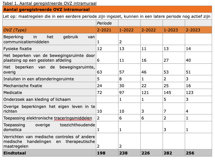 In de cijfers uit Bijlage 1 is te zien dat 33 klanten onvrijwillige zorg hebben ontvangen, terwijl zij met een vrijwillige status zijn opgenomen. Dit is onder bepaalde voorwaarden mogelijk en wordt getoetst door de Wzd-functionarissen.