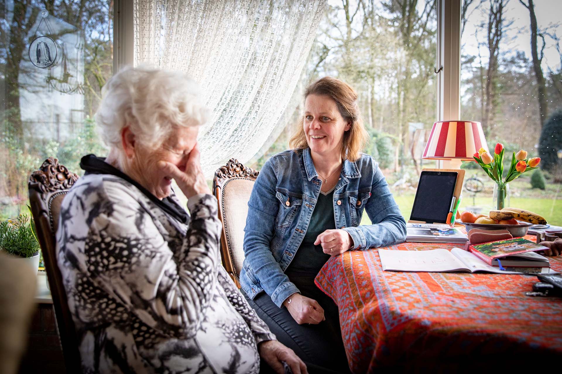 “Bij een huisbezoek prik je er zo doorheen als mensen doen alsof alles goed gaat”, zegt Charella. “Je drinkt samen wat en je hebt het samen over ditjes en datjes. Dat heb je echt even nodig om iemand uiteindelijk aan de praat te krijgen over hoe het echt met iemand gaat. Ik was dan ook blij, en de klanten ook, dat ik langzaamaan de huisbezoeken weer op kon starten. Als aanvullend hierop blijven we zorg op afstand bieden via videobellen. Dan gaat het meer om iemand gerust te stellen als er vragen zijn en om even in contact te staan. Dat kan juist heel goed door middel van beeldbellen, als iemand daarvoor openstaat en het bij de situatie past.”