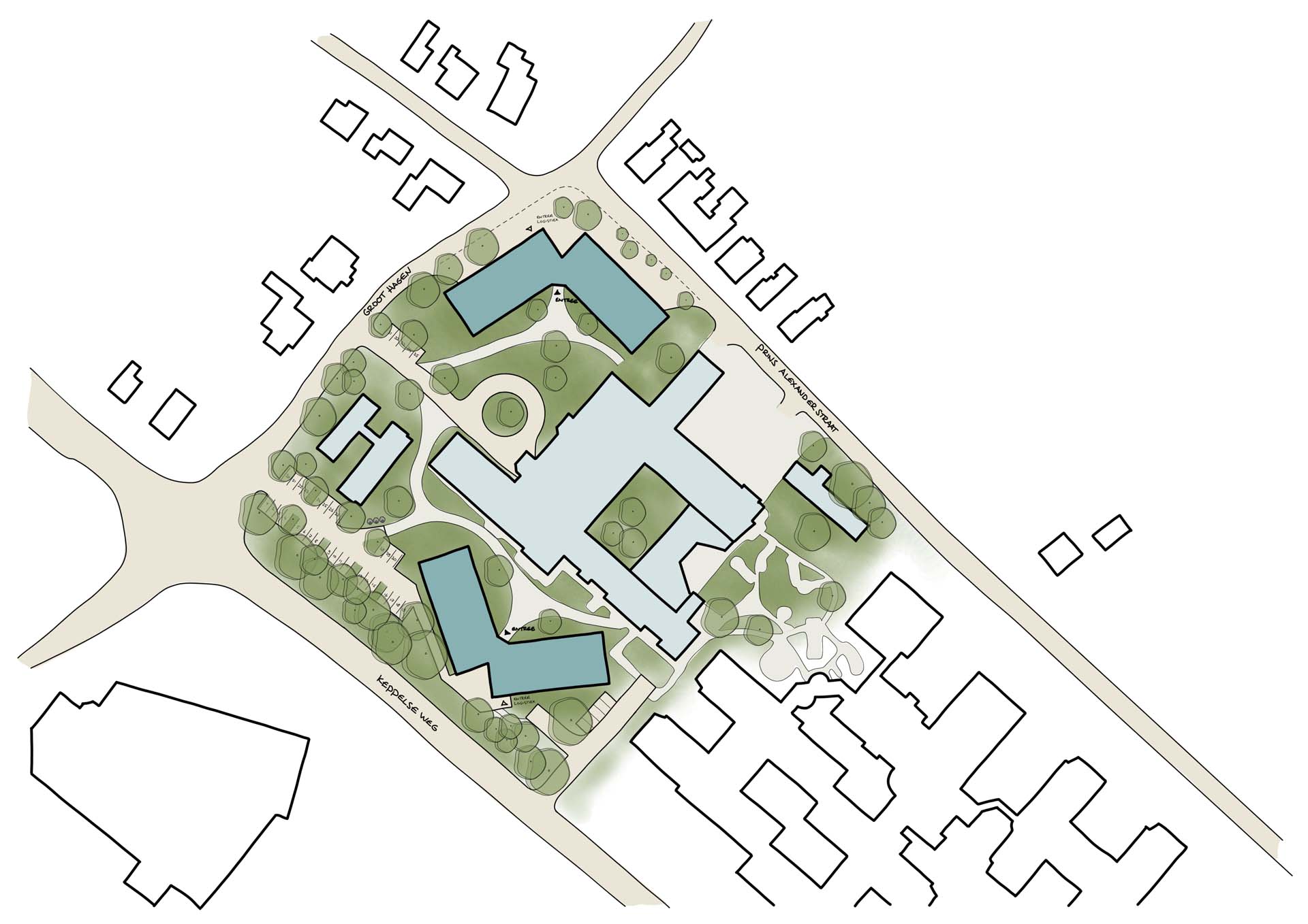 Op basis van deze inzichten is een ontwerp opgesteld waarin twee gebouwen staan getekend met elke 32 studio’s (4 groepen van 8 bewoners), dus 64 studio’s in totaal. Het plan is dat de nieuwbouw gerealiseerd wordt naast de bestaande bebouwing. De oudbouw wordt verwijderd na oplevering van de nieuwbouw en als de revalidatie locatie bij het nieuwe Slingeland is gerealiseerd: naar verwachting niet eerder dan in 2026. Op het terrein dat vrijkomt, kunnen in een latere fase woningen worden gebouwd voor diverse groepen inwoners. Lindenhovius: “Daarmee ontstaat een open, groene en inclusieve woonomgeving, die in verbinding staat met de bestaande wijk. Zo verkleinen we de afstand tussen bewoners van Den Ooiman en andere inwoners van Doetinchem.”