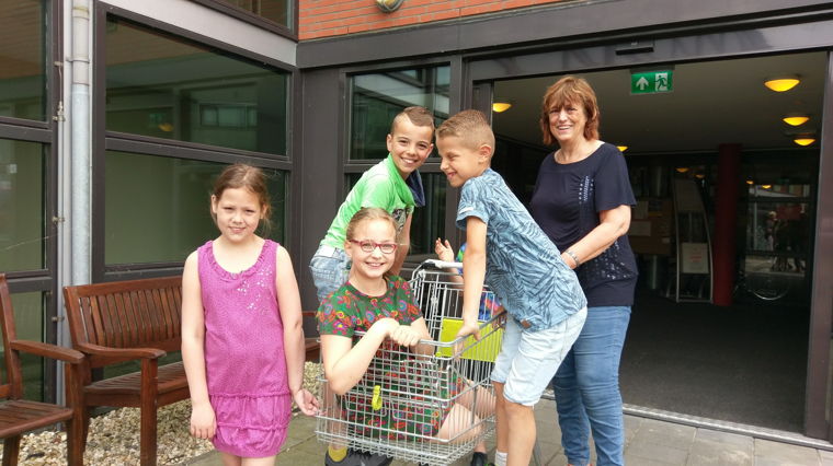 Daarna wordt de groep opgesplitst: Een aantal kinderen gaat mee met Diny Sanders, die vanuit Waterrijk het initiatief heeft genomen. Ze lenen een winkelwagentje bij de naburige Jumbo-supermarkt om de oude kranten op te halen die bewoners voor hun deur hebben gelegd. De andere kinderen scharen zich rond de tafels om spelletjes te doen met de bewoners die daar zin in hebben.