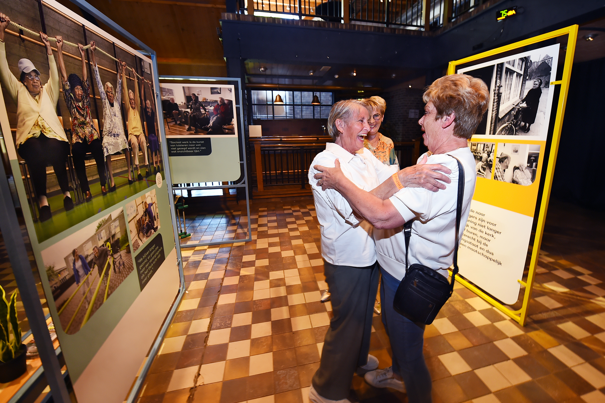 De tentoonstelling brengt letterlijk generaties samen. Tijdens de opening stonden de jubilarissen schouder aan schouder met drie kersverse collega’s. Margje: “Zij brengen wijsheid en ervaring, de jongeren brengen nieuwe vragen en inzichten. Dat gesprek willen we ook stimuleren.” De tentoonstelling bevat foto’s, citaten en cijfers, maar ook interactieve elementen zoals een ‘mantelzorgsimulator’, een ‘schaduworgel’ en de ‘vooruitkijkspiegel’. De expositie werd ontwikkeld door Over Morgen en reist de komende maanden door het hele land om overal het gesprek over de zorg van morgen aan te wakkeren.